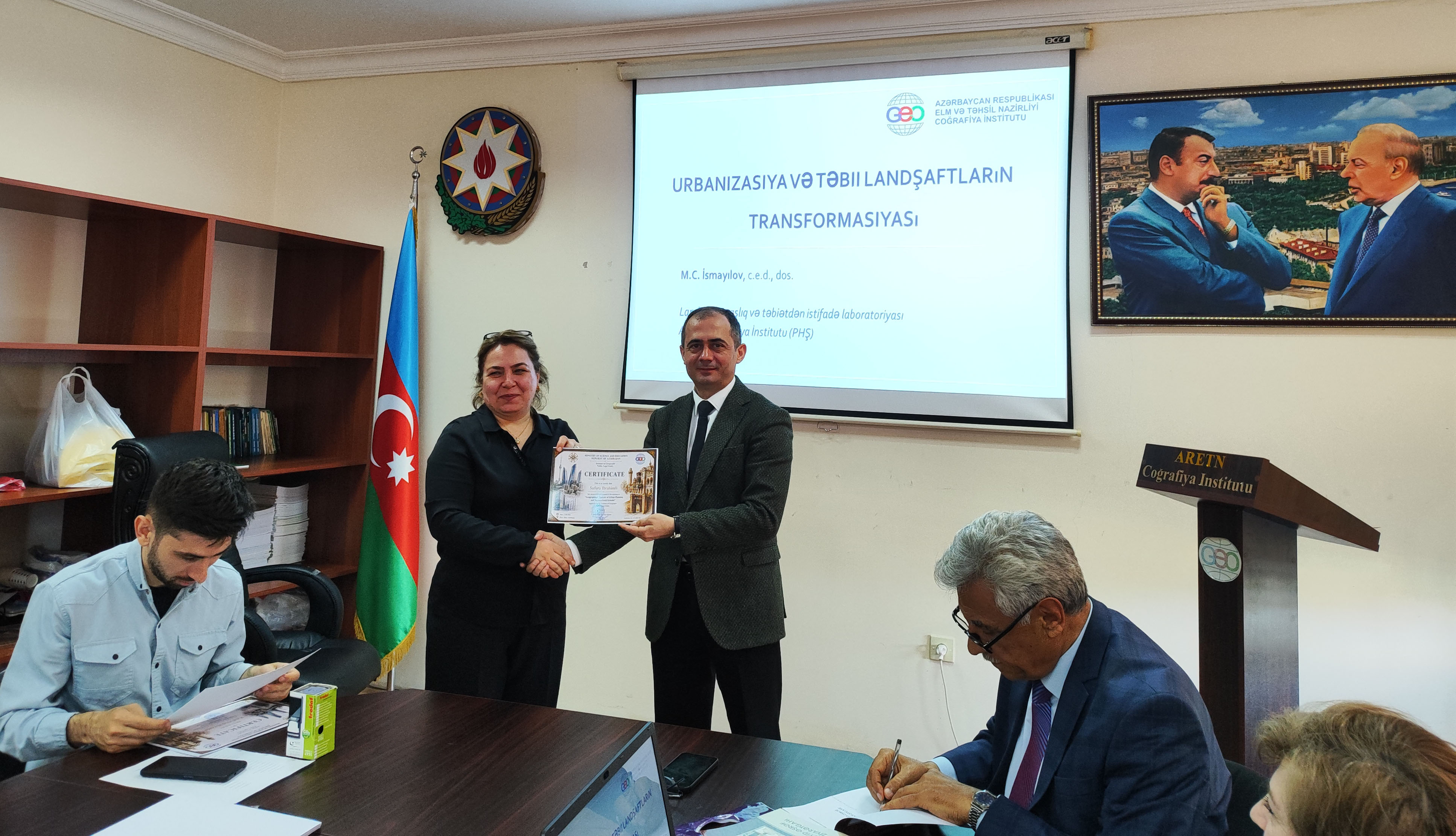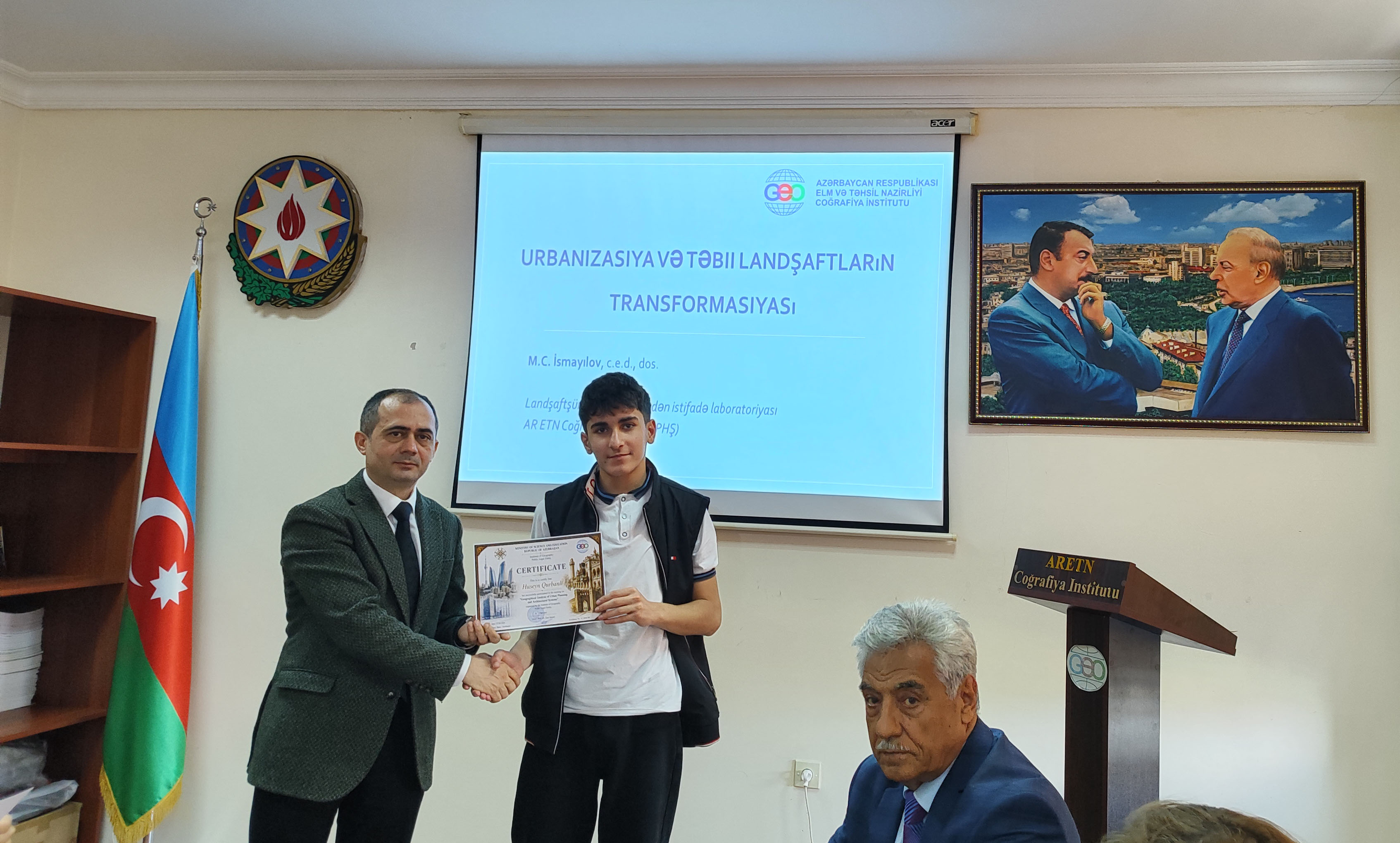 Daha sonra İnstitutun Landşaftşünaslıq və təbiətdən istifadə laboratoriyasının müdiri, coğrafiya elmləri doktoru, dosent Mirnuh İsmayılov “Urbanizasiya və təbii landşaftların transformasiyası” mövzusunda təqdimatla çıxış edib. Alim sürətli urbanizasiya nəticəsində təbii landşaftlarda baş verən dəyişikliklərdən, yaşıllıq sahələrinin azalmasından və ekoloji tarazlığın pozulması risklərindən danışıb. O, ərazi üzrə ekoloji karkas anlayışını izah edərək bildirib ki, bu sistem şəhər və regionlarda təbii elementlərin vahid şəbəkə şəklində qorunmasını nəzərdə tutur. Təqdimatda ekoloji dəhlizlərin əhəmiyyəti, biomüxtəlifliyin qorunmasında rolu, həmçinin landşaft-ekoloji karkasın idarəetmə strukturunun təşkili məsələləri şagirdlərin diqqətinə çatdırılıb. Mirnuh İsmayılov yeni “hibrid yaşıl dəhliz” modelindən də bəhs edərək qeyd edib ki, bu yanaşma şəhərsalma ilə təbiətin qorunmasını uzlaşdırmağa imkan verir.